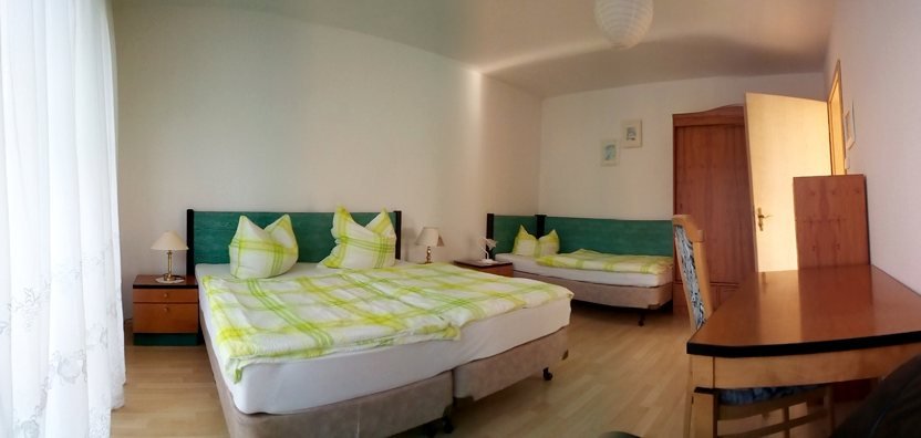 Ist ein großes helles Doppelzimmer mit zwei möglichen Aufbettungen in moderner Ausstattung, incl. Wohnraum, offene Küche und Bad.